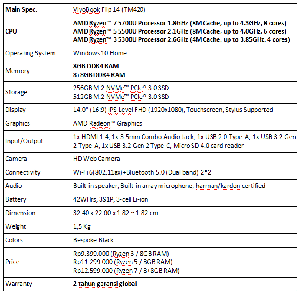 VivoBook Flip 14 (TM420) merupakan laptop yang ditenagai prosesor AMD Ryzen 5000 Mobile Series terbaru yang sudah menggunakan arsitektur Zen3 serta pemrosesan 7nm. Prosesor generasi terbaru dari AMD ini tidak hanya memiliki performa lebih baik dari generasi sebelumnya, tetapi juga lebih efisien sehingga membuat laptop VivoBook terbaru kali ini lebih powerful dan tetap hemat baterai.