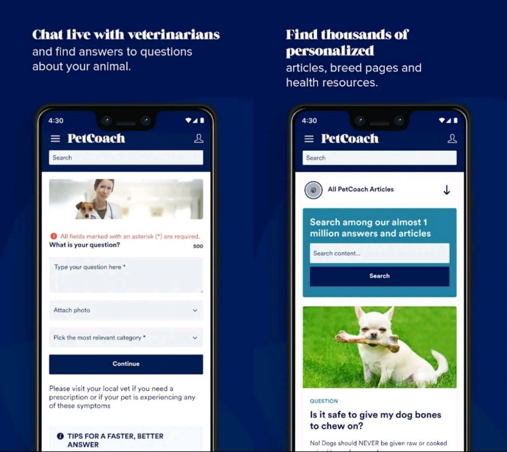 PetCoach adalah layanan yang memberikan jawaban atas pertanyaan sehari-hari tentang kesehatan hewan peliharaan. PetCoach berisi ratusan artikel yang ditulis oleh dokter hewan tentang kesehatan, perilaku, nutrisi, dan perawatan hewan peliharaan.