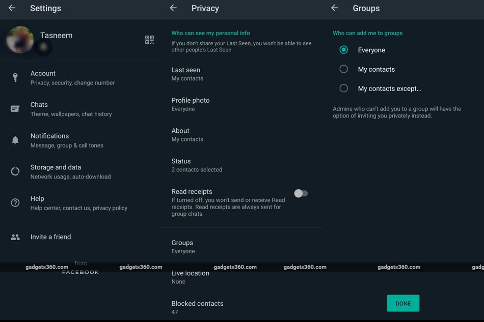 - Opsi ‘Kontak Saya’ hanya memungkinkan pengguna tersebut menambahkan Anda ke grup yang nomornya telah Anda simpan di daftar kontak Anda.