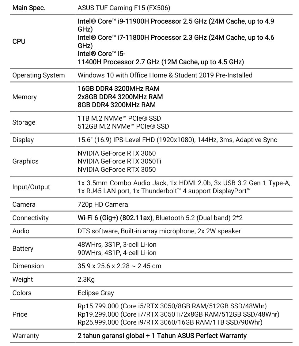 TUF Gaming F15 (FX506) merupakan laptop gaming ASUS pertama yang menggunakan prosesor High Performance 11th Gen Intel Core (H45) yang hadir di Indonesia. Selain itu, ASUS juga menghadirkan desain baru untuk seri TUF Gaming F15 (FX506)