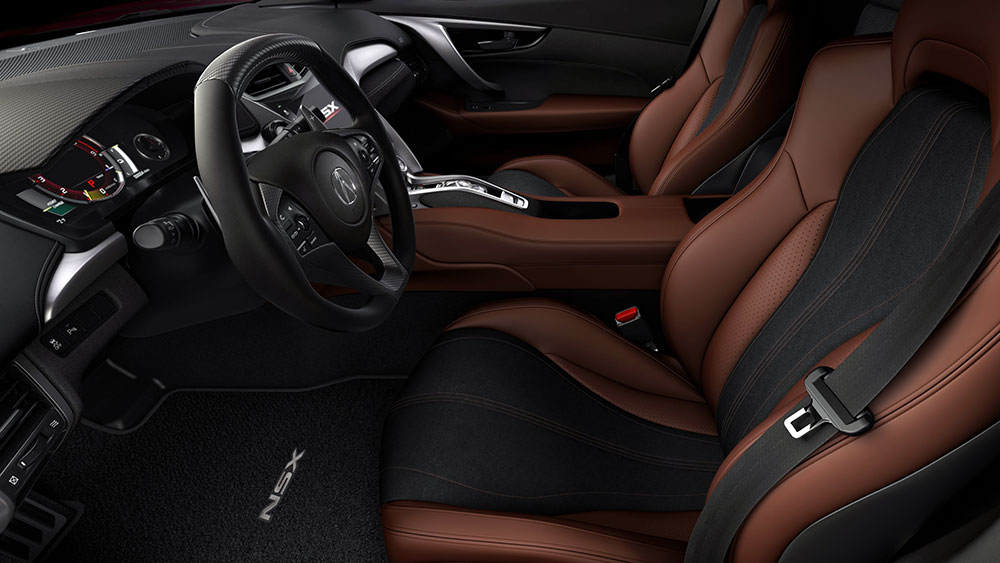 Di dalam kabin, pilihan warna Acura NSX juga diperkaya dengan tambahan opsional kursi berbahan semi-leather dengan nuansa Indigo Blue dan material dari Alcantara. Sedangkan untuk pilihan kursi full-leather (non-Alcantara) juga tersedia dalam pilihan warna Red dan Ebony.