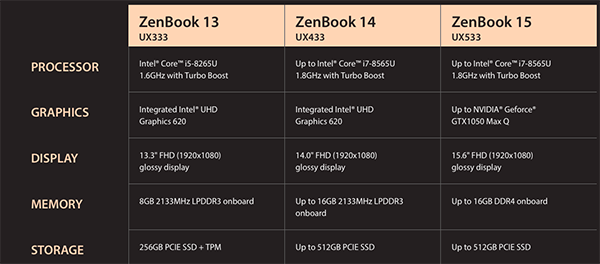 Opsi GPU NVIDIA GeForce MX150 tersedia untuk ZenBook 13 dan 14, sedangkan untuk ZenBook 15 ditenagai oleh GPU yang lebih kencang, yakni NVIDIA GeForce GTX 1050 Max-Q.