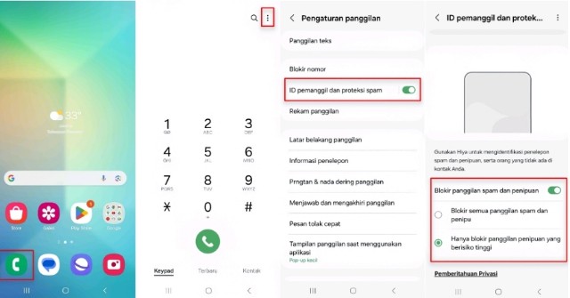- Cara mengaktifkan: Buka aplikasi telepon > Klik ikon tiga titik > Pengaturan > Aktifkan ID Pemanggil dan Proteksi Spam.