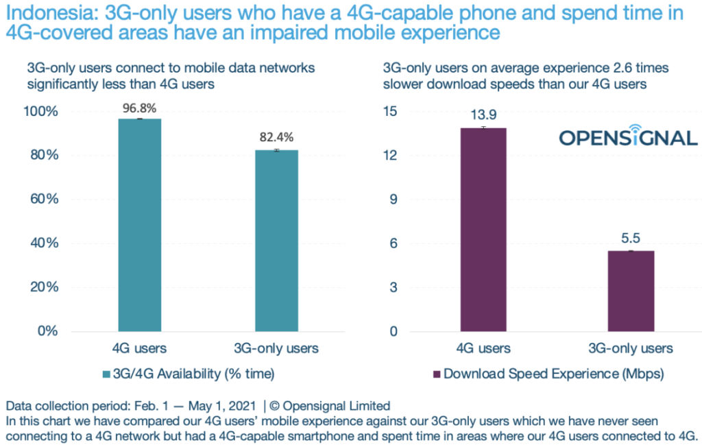 Selanjutya, dari analisis yang dilakukan OpenSignal menunjukkan pengguna smartphone 3G di Indonesia mempunyai kecepatan unduh yang rendah, rata-rata 5,5 Mbps. Kecepatan itu 60% lebih lambat dibandingkan dengan kecepatan unduh pengguna 4G (rata-rata 13,9 Mbps). 82,4% 3G-only users terhubung ke jaringan data seluler setiap saat, lebih rendah 14,4% dari para pengguna koneksi 4G. Hal ini menggambarkan bahwa 3G-only users yang berada di area jangkauan 4G akan mengalami peningkatan pengalaman penggunaan seluler apabila meningkatkan layanan ke teknologi 4G.