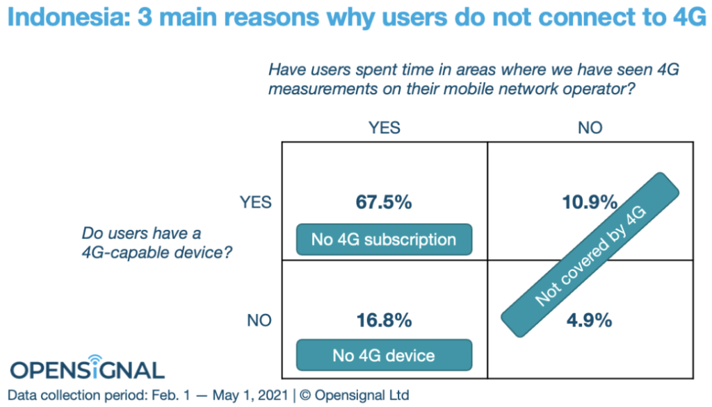 - Pengguna tidak terjangkau oleh jaringan 4G: 10,9% dari 3G-only users memiliki smartphone yang berkemampuan 4G, tetapi pengguna menghabiskan waktu di area yang tidak terjangkau 4G dari operator seluler mereka. Artinya, pengguna tidak memakai 4G karena area mereka tidak terjangkau oleh 4G. Sebagai tambahan, 4,9% dari 3G-only users tidak memiliki perangkat yang berkemampuan 4G dan mereka juga berada di area yang tidak terjangkau teknologi 4G, sehingga 15,8% masyarakat Indonesia tidak pernah memakai 4G.