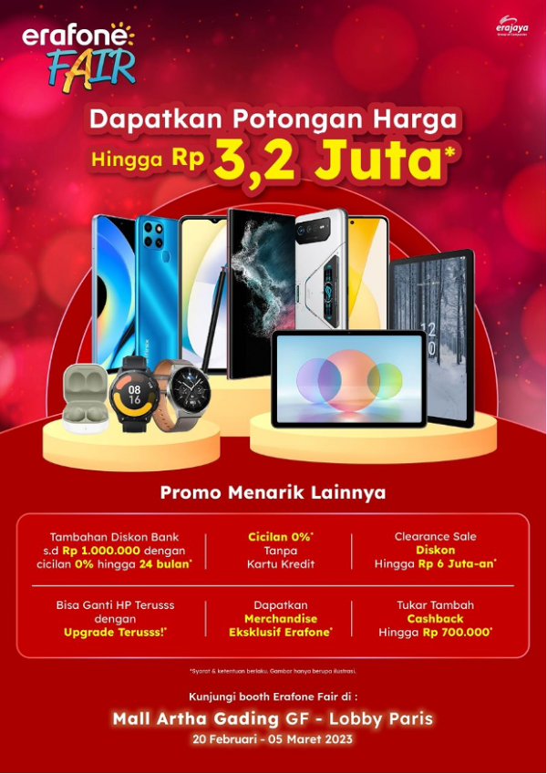 Erajaya Digital menggelar Erafone Fair yang berlangsung pada 20 Februari-5 Maret Joy Wahjudi, CEO Erajaya Digital, mengatakan, “Sebuah kebahagiaan bagi Erajaya Digital dapat kembali menggelar Erafone Fair pada tahun ini setelah sempat absen pada tahun lalu.