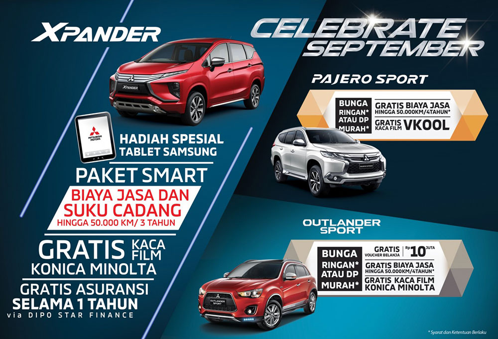 Dan selama exhibition tersebut dan juga salama pembelian Mitsubishi di bulan September 2018, MMKSI juga memberikan program menarik setiap pembelian all varian Mitsubishi diantaranya gadget, gratis asuransi selama 1 tahun, gratis biaya jasa service selaa 4 tahun atau hingga 50.000 km, gratis asuransi kecelakaan satu tahun, gratis kaca film Konica Minolta dan masih banyak lagi. (rym)