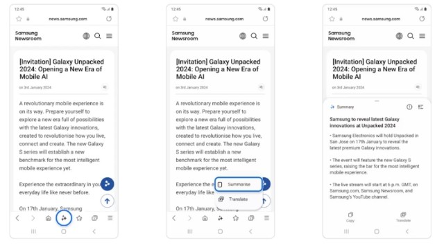 Melengkapi pengalaman produktif yang lebih canggih, Galaxy AI juga punya fitur Browsing Assist yang membantu merangkum artikel dan menerjemahkan isi dari browser.