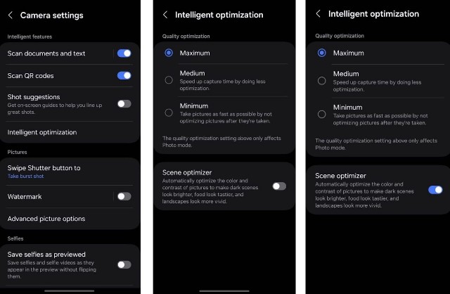 Fitur Intelligent Optimization memungkinkan pengguna untuk menyesuaikan hasil foto sesuai dengan preferensi mereka. Dengan tingkat pemrosesan yang dapat diatur, pengguna dapat memaksimalkan detail dan ketajaman foto sesuai keinginan.