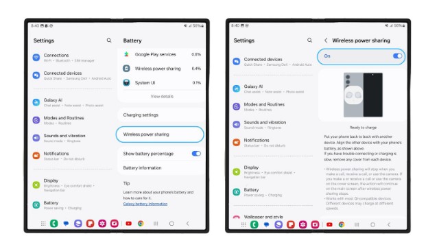 Salah satu fitur menarik dari Galaxy Z Flip6 | Z Fold6 adalah Wireless Power Sharing. Fitur ini memungkinkan pengguna berbagi daya dengan perangkat Galaxy lainnya, seperti Galaxy Buds atau Galaxy Watch. Cara mengaktifkannya: