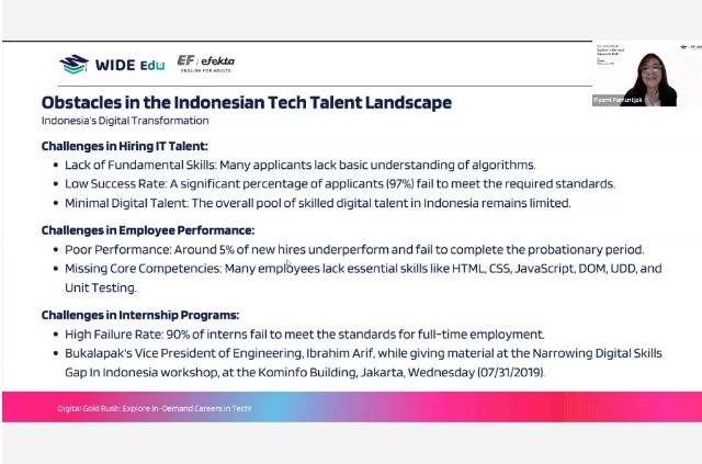 review1st.com – Untuk menjadi negara maju, Indonesia membutuhkan sumber daya manusia yang kompeten dalam bidang digital. Dalam rangka mendukung hal tersebut, EF EFEKTA English for Adults bekerja sama dengan WIDE Edu menggelar webinar bertema “Digital Gold Rush: Explore In-demand Careers in Tech!†pada Senin (18/11/2024).