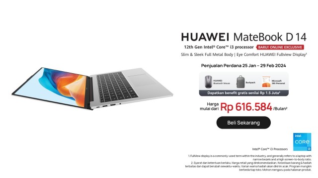 Voucer ini bisa langsung digunakan mulai 25 Januari 2024 mendatang, dan pelanggan bisa langsung membeli varian HUAWEI MateBook D14 terbaru ini di HUAWEI Official Store di , , , , dan TikTok Shop.