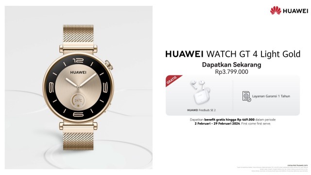 Smartwatch yang masih dalam satu lini HUAWEI WATCH GT 4 ini resmi hadir dengan harga Rp3.799.000 dan mulai bisa didapatkan pada 2 Februari 2024 mendatang.