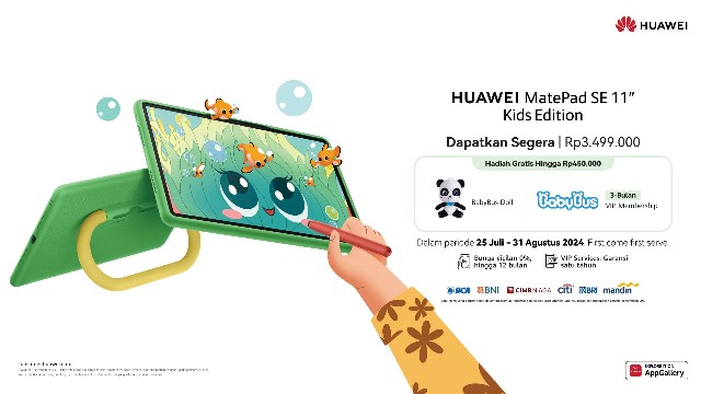 Selama sesi Penjualan Perdana dari 25 Juli hingga 31 Agustus 2024, HUAWEI MatePad SE 11 Kids Edition tersedia dengan harga Rp3.499.000. Pembelian selama periode ini dilengkapi dengan bonus BabyBus Doll dan aplikasi BabyBus VIP membership selama 3 bulan senilai Rp450 ribu.