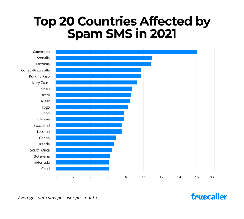 - Dari 20 negara ini, Brazil memiliki kelas tersendiri. Sepuluh negara berikutnya dalam daftar terklasifikasi dalam satu kelompok dengan rata-rata panggilan spam yang sebanding, semenara sembilan negara lainnya mencatatkan setiap pengguna menghadapi angka spam yang berkisar antara 4.5 – 6.7 panggilan spam setiap bulan.Laporan ini merupakan analisis yang cermat dari miliaran panggilan yang diterima pengguna Truecaller di seluruh dunia. Pengguna Truecaller memiliki kesempatan untuk memberi nama nomor-nomor spam atau menandai telepon dengan identitas dan kategori bisnis yang sesuai. Hal ini membantu Truecaller dalam menetapkan berbagai jenis panggilan spam. Dalam penyusunan laporan ini, tidak ada panggilan dan SMS yang direkam dan dibaca Truecaller. Seluruh data dikumpulkan secara anonim, dan tidak untuk dilacak oleh siapapun.