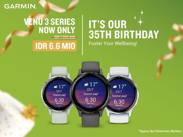 Sebagai bagian dari perayaan ulang tahun Garmin ke-35, terdapat diskon spesial untuk Venu 3 Series. Dari harga normal Rp 7,999,000, kini ditawarkan seharga Rp 6,560,000 selama periode promosi 13-22 September 2024.