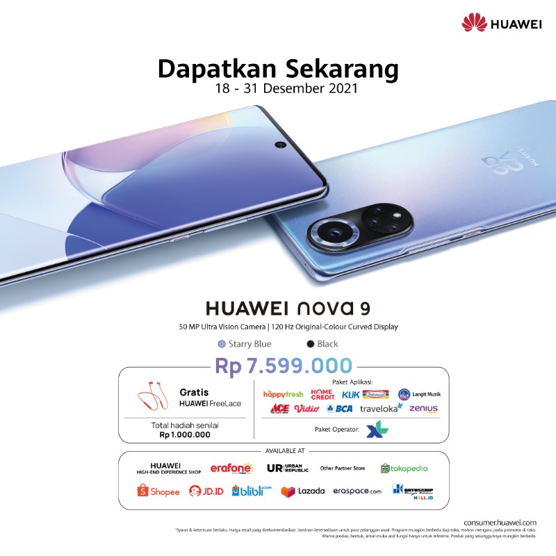 Sedangkan, HUAWEI nova 9 dibandrol dengan harga Rp7.599.000 dengan tambahan HUAWEI FreeLace senilai Rp1.000.000.