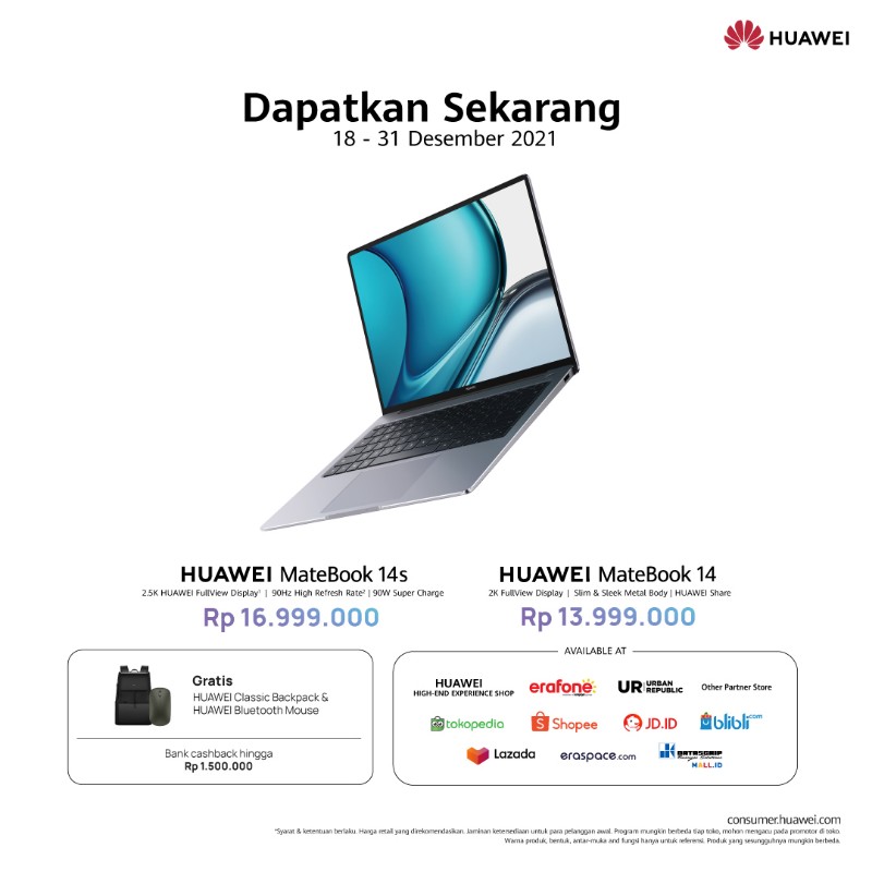 Dalam pembelian salah satu laptop HUAWEI MateBook seri terbaru ini, pelanggan berkesempatan mendapatkan HUAWEI Classic Backpack dan Bluetooth Mouse senilai Rp1.500.000.