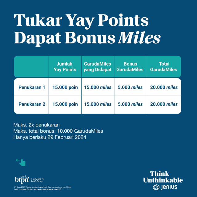 Bonus ini berlaku untuk penukaran 15.000 Yay Points ke GarudaMiles dari aplikasi Jenius pada 29 Februari 2024. Dengan begitu, pengguna dapat lebih maksimal dalam mengumpulkan miles untuk berbagai tujuan traveling mereka.