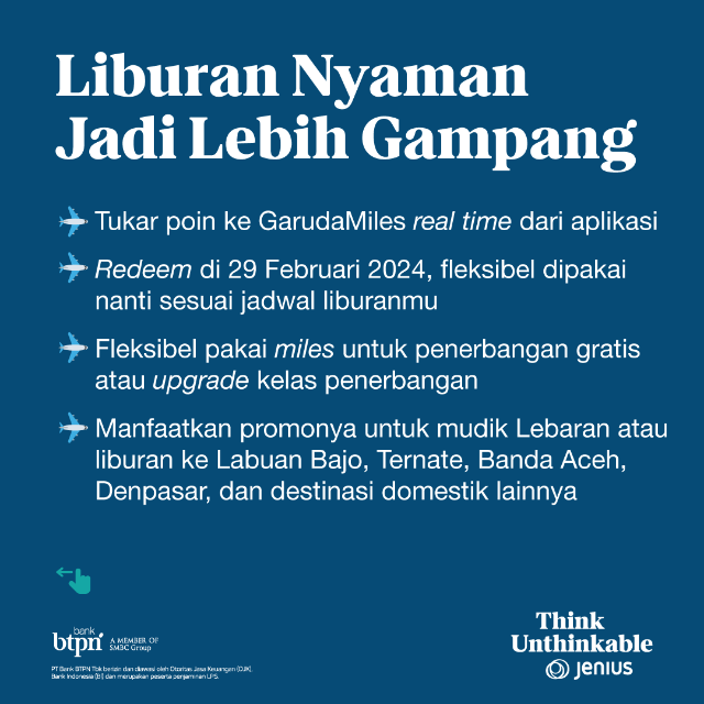 Untuk menyikapi hal ini, kami dengan bangga menghadirkan kerjasama dengan Garuda Indonesia, memperkenalkan GarudaMiles sebagai salah satu rewards yang bisa ditukarkan secara real time langsung dari aplikasi Jenius. Ini adalah langkah strategis kami untuk memberikan pilihan rewards yang sesuai dengan kebutuhan pengguna Jenius.”