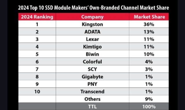Data TrendForce mengungkapkan bahwa Kingston tidak hanya mempertahankan posisi puncaknya, tetapi juga mencatat pertumbuhan pangsa pasar dibandingkan tahun 2023.