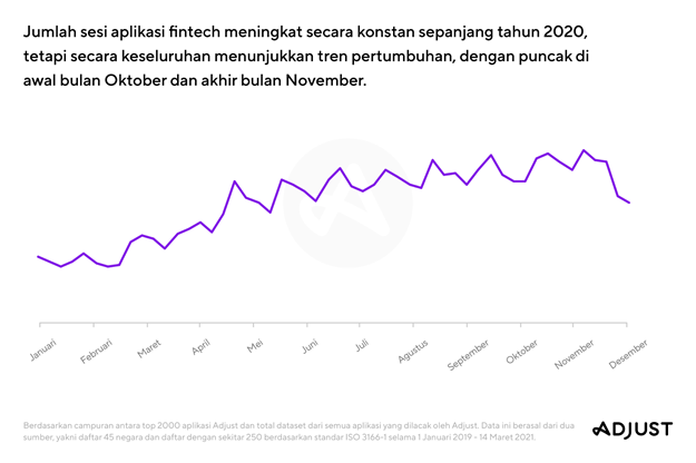 - Jumlah sesi aplikasi fintech juga meningkat di tahun 2020 — ini menunjukkan peralihan yang signifikan menuju perbankan dan pembayaran digital. Jumlah sesi meningkat sebesar 85% YoY dan telah meningkat sebesar 35% di tahun 2021.