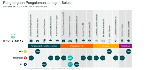 Hasilnya menunjukkan persaingan ketat antar operator dalam berbagai kategori penting seperti kecepatan unduh, konsistensi kualitas, keandalan jaringan, pengalaman video, dan aplikasi suara.
