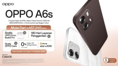 Dengan sertifikasi IP69 untuk ketahanan air dan debu, baterai 7000mAh dengan 80W SUPERVOOC, serta jaminan kelancaran hingga lima tahun, OPPO A6s memberikan pengalaman penggunaan yang lebih nyaman,” ujarnya.