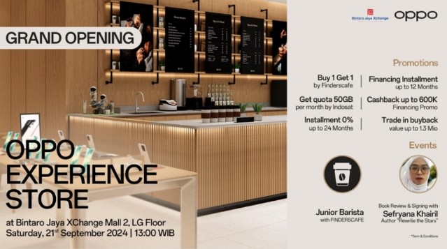 Untuk merayakan pembukaan, OPPO menawarkan promo menarik, termasuk kuota 50GB/bulan dari Indosat, cashback hingga Rp600.000, cicilan 0% hingga 24 bulan, dan trade-in buyback hingga Rp1.300.000. Promo Buy 1 Get 1 untuk semua minuman di Finders Cafe dan diskon hingga 50% untuk produk pilihan juga tersedia.