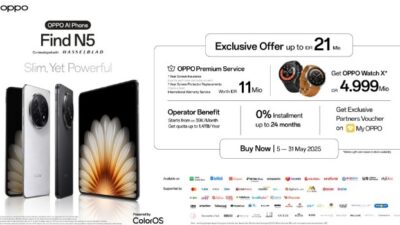 OPPO Find N5 sudah tersedia resmi di Indonesia dengan harga Rp27.999.000. Konsumen akan mendapatkan berbagai benefit eksklusif senilai total Rp21 juta, termasuk OPPO Watch X gratis, layanan OPPO Premium Service selama 1 tahun, bonus operator, cicilan 0% hingga 24 bulan, dan voucher belanja yang bisa ditukarkan melalui aplikasi MyOPPO.