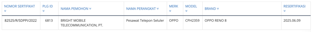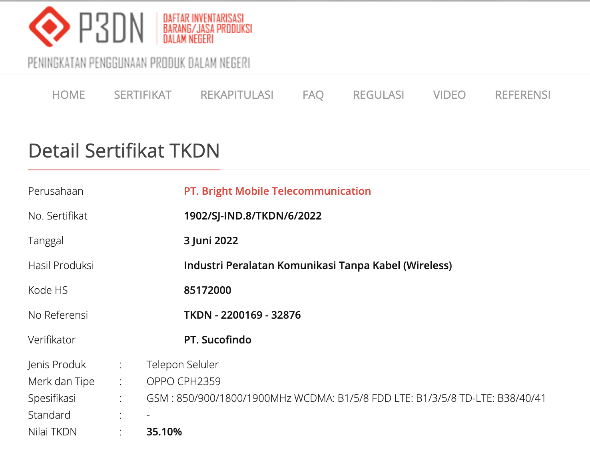 Selain itu, setelah ditelusuri menggunakan model perangkat OPPO Reno8 yakni CPH2359, ditemukan sertifikat TKDN yang telah terdaftar pada situs P3DN Kemenperin.
