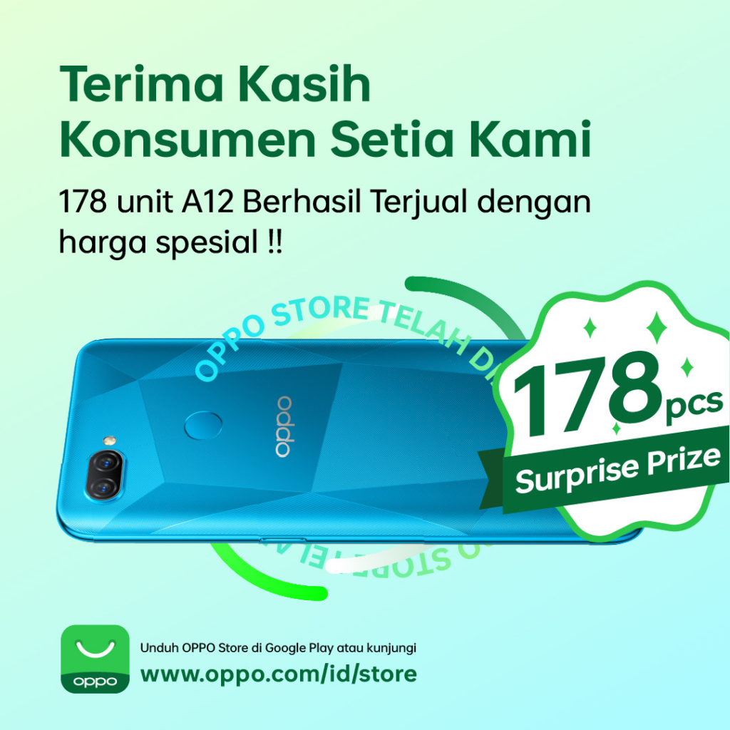 “Tadinya kami hanya menyediakan unit yang terbatas untuk penjualan kilat Rp. 1000. Quota yang kami sediakan hanya 4 unit saja. Namun, mengingat antusiasme konsumen terhadap OPPO Store, maka kemarin kami berhasil menjual 178 unit OPPO A12 dengan 1000 rupiah,” tambah Aryo.