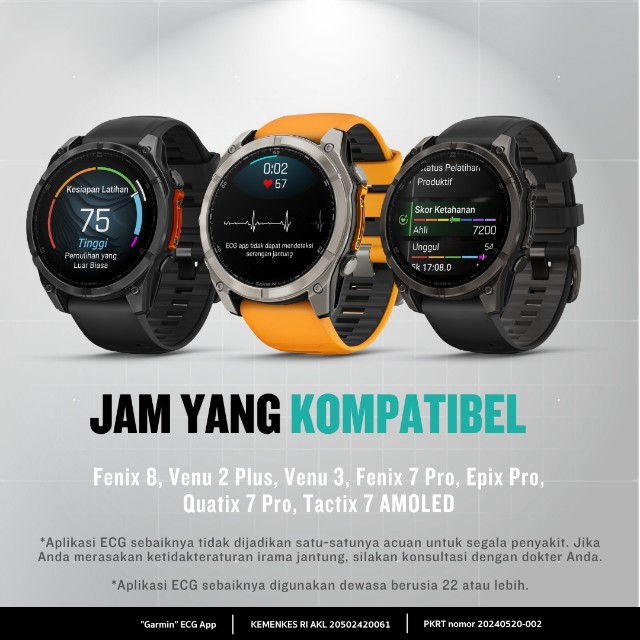 Fitur ECG App di Garmin f?nix 8 Series telah disetujui oleh Kementerian Kesehatan Indonesia, memastikan keamanannya. Meskipun ECG App ini tidak memberikan diagnosis definitif, alat ini membantu Anda memantau kesehatan jantung secara proaktif.