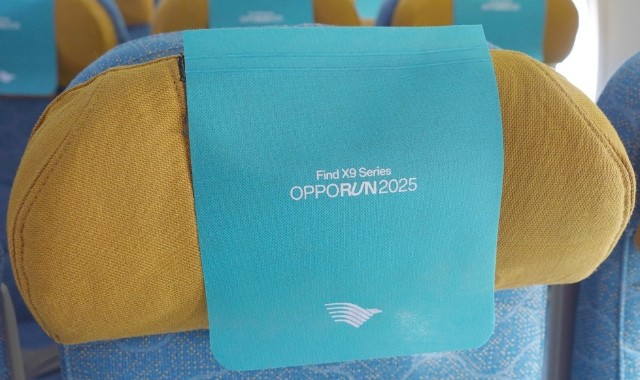 Pada penerbangan rute Jakarta–Denpasar, kursi kelas ekonomi Garuda Indonesia dihiasi headrest cover khusus bertema OPPO, memberikan kesan premium sekaligus membangun atmosfer semangat menjelang lomba.