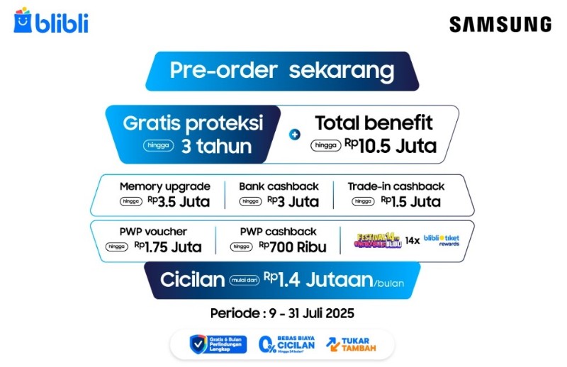Sebagai mitra resmi Samsung, Blibli menawarkan beragam promo eksklusif pre-order Samsung Galaxy Z Fold7 dan Z Flip7 yang memberikan nilai tambah dan pengalaman belanja terbaik bagi pelanggan setia Samsung.