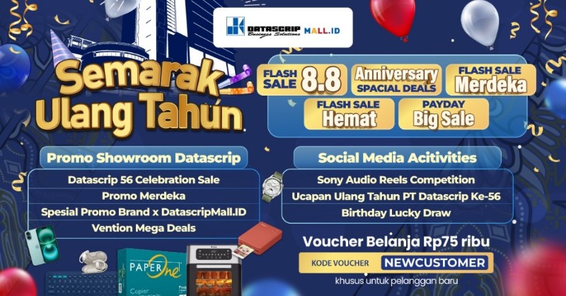 Promo DatascripMall.ID Agustus 2025 menghadirkan beragam penawaran terbaik untuk merayakan HUT RI ke-80 dan ulang tahun ke-56 PT Datascrip.