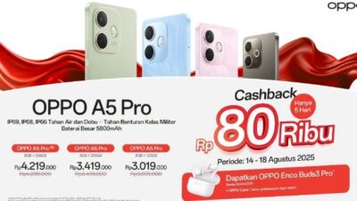 - Gratis OPPO Enco Buds3 Pro senilai Rp449.000 & Garansi OPPO Care 1 Tahun untuk A5 Pro 5G & A5 Pro (256GB).