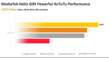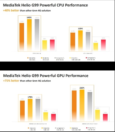 Berdasarkan pengujian yang dilakukan didapatkan performa CPU yang dihasilkan oleh MediaTek Helio G99 tercatat 40% lebih baik dibandingkan chipset 4G berteknologi 6nm lain, sementara 75% lebih baik untuk sektor GPU.