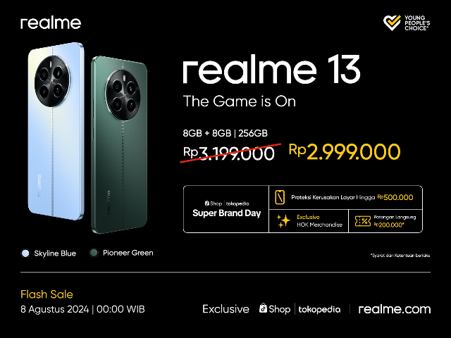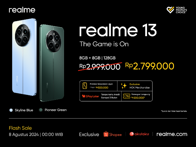 Selama Flash Sale pada 8 Agustus 2024 mulai pukul 00.00 WIB, ada potongan harga Rp200.000 untuk pembelian realme 13.