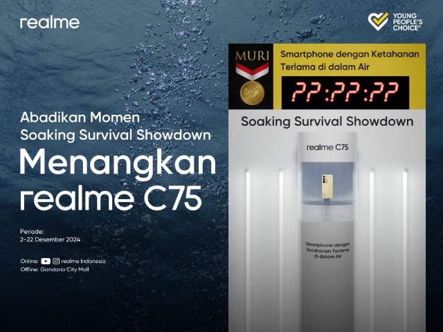 - 14 Desember 2024: realme akan mencoba memecahkan rekor MURI dengan menguji ketahanan realme C75 di dalam air dalam waktu terlama.