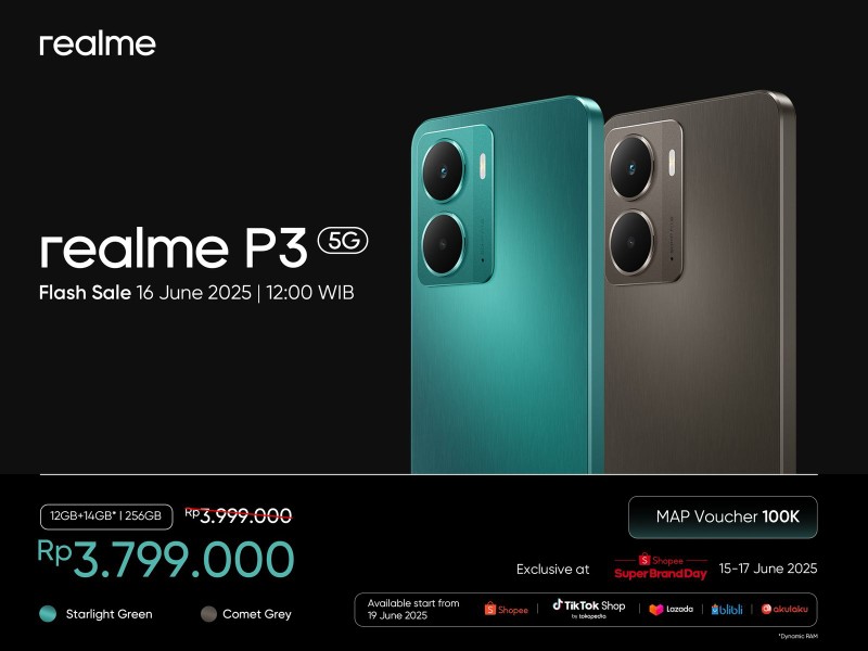 realme P3 5G akan tersedia eksklusif di Shopee pada 16–18 Juni 2025 selama Shopee Brand Day, dengan harga promo spesial Rp3.799.000.