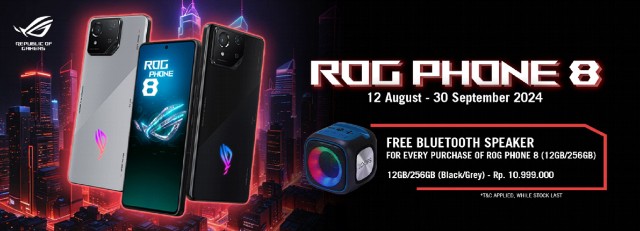 ASUS memberikan penawaran spesial berupa Bluetooth Speaker gratis untuk pembelian ROG Phone 8 varian 12/256GB. Penawaran ini tersedia di mitra penjualan resmi offline seperti ERAFONE, Urban Republic, ROG Store, serta di mitra online resmi ASUS, termasuk Tokopedia.