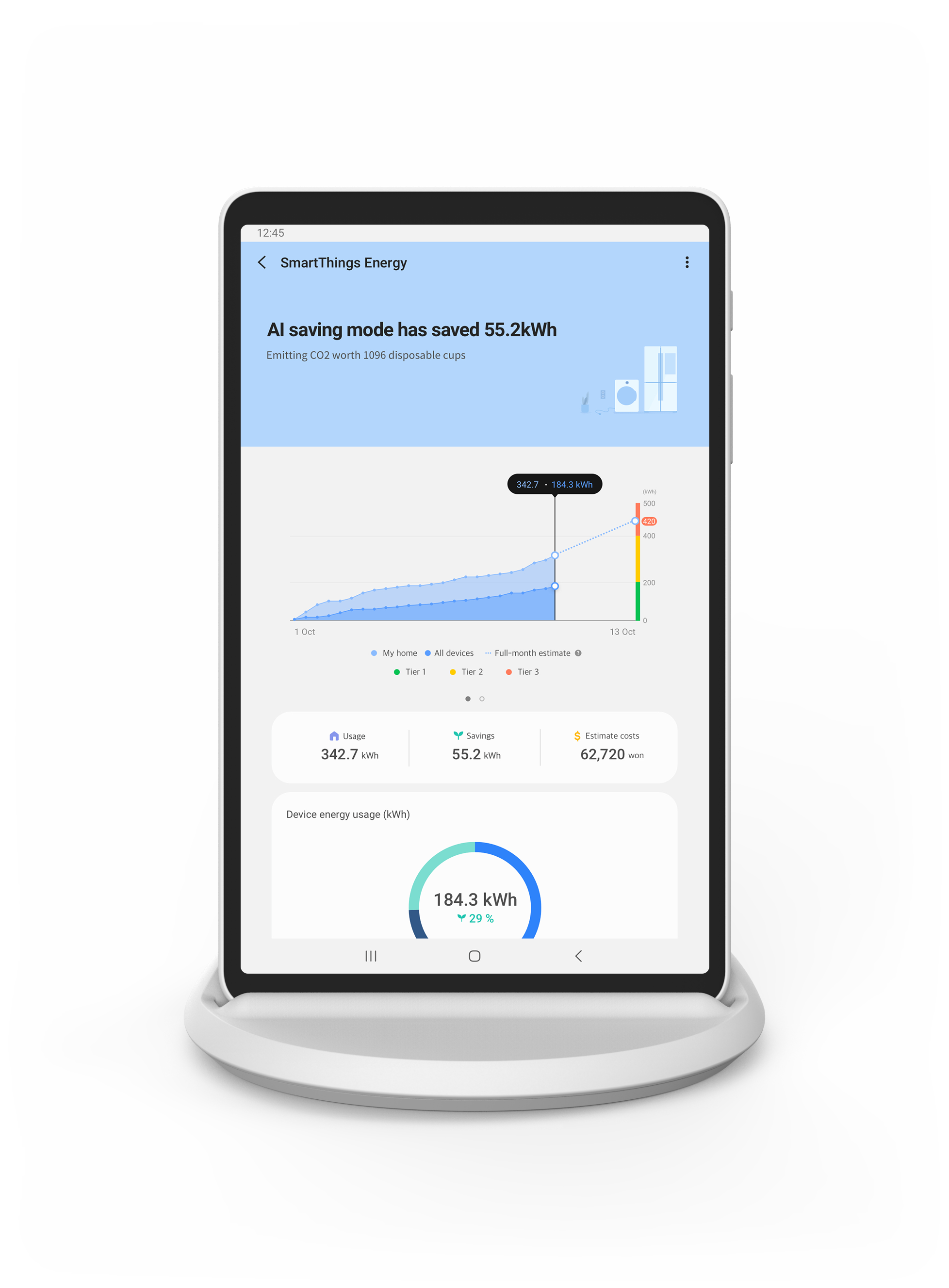 Untuk membantu Anda menghemat biaya listrik, SmartThings Energy[i] di Samsung Home Hub menganalisis pola penggunaan elektronik rumah Anda[ii] dan menggunakan mode hemat daya yang dilengkapi AI untuk membantu mengurangi tagihan listrik.