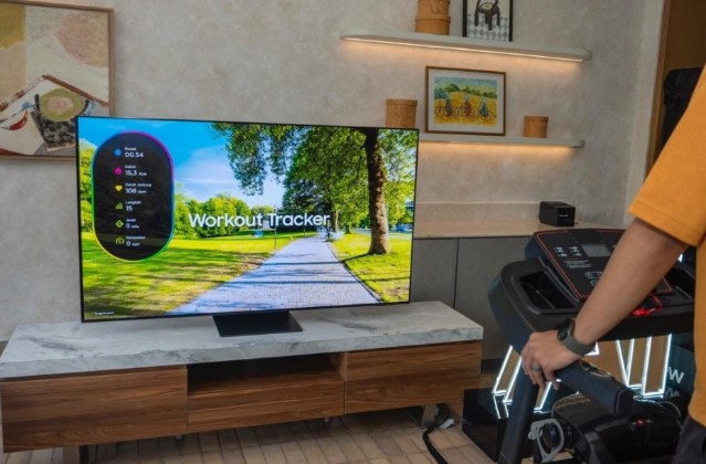 Samsung OLED TV dilengkapi Workout Tracker, memungkinkan Anda memantau latihan seperti durasi, kalori terbakar, dan detak jantung secara real-time di layar TV.