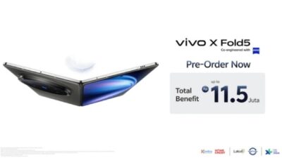 vivo X Fold5 sudah tersedia melalui program pre-order mulai 28 Agustus hingga 18 September 2025 dengan harga resmi Rp24.999.000 (16GB + 512GB). Pelanggan bisa menikmati berbagai penawaran menarik, baik online maupun offline.
