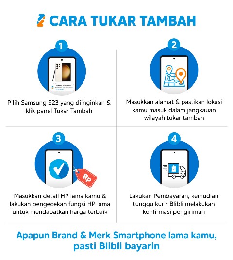 Pelanggan mulai hari ini dapat membeli Samsung Galaxy S23 Series 5G dengan harga lebih terjangkau lewat fitur Tukar Tambah yang tersedia online lewat aplikasi dan website, serta secara offline di 50 gerai toko fisik Blibli Store dan Toko Tukar Tambah yang tersebar di seluruh Indonesia,†ujar Wisnu Iskandar, Executive VP Trade Partnership Gadget & Electronics Blibli.