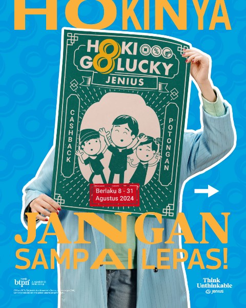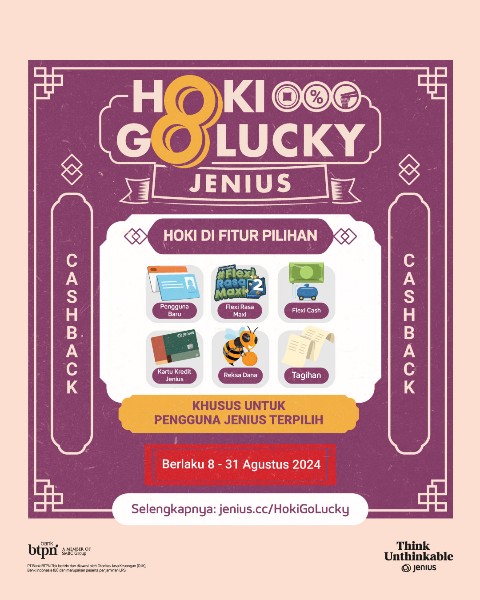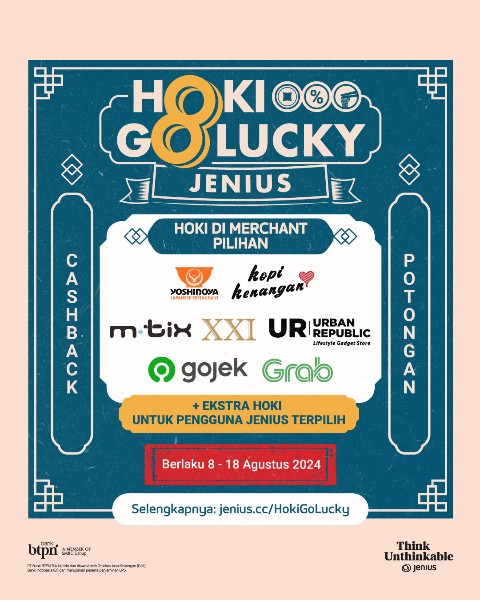 Program Hoki Go Lucky memberikan kesempatan kepada pengguna terpilih untuk meraih hadiah ekstra. Misalnya, Teman Jenius yang terpilih dapat menikmati ekstra cashback Rp25.000 untuk transaksi di Kopi Kenangan atau cashback hingga Rp300.000 untuk pembelian gadget di Urban Republic menggunakan Kartu Kredit Jenius. Promo ini berlaku dari 8 hingga 18 Agustus 2024.