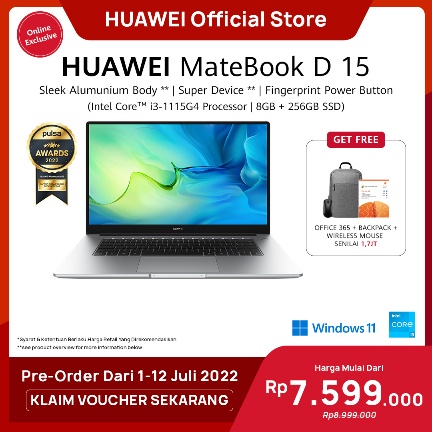 Selama periode 1 hingga 12 Juli 2022, pelanggan dapat melakukan pre-order untuk HUAWEI MateBook D15 i3 11th Gen seharga Rp7.599.000 dengan GRATIS Backpack, Wireless Mouse, dan Office 365 dengan nilai total hingga Rp1,7 Juta.