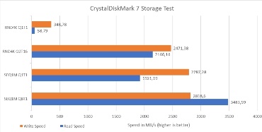 Penyimpanan ROG Flow Z13 (GZ301) sendiri menggunakan M.2 NVMe PCIe 4.0 x4 SSD 2230 yang ukurannya lebih pendek dari PCIe SSD yang digunakan di laptop gaming pada umumnya. SSD yang digunakan di ROG Flow Z13 (GZ301) cukup kencang dengan hasil pengujian sebagai berikut: