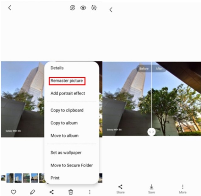 Di situlah saatnya kamu sudah bisa mulai menggunakan fitur Photo Remaster di Galaxy M54 5G, untuk meningkatkan kualitas fotomu menjadi lebih hidup dan jernih dalam resolusi tinggi. Caranya: